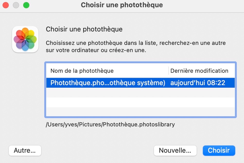 Appuyer sur la touche Option avant de cliquer sur l'application Photos vous fera apparaître la liste des photothèques sur votre Mac. Comme ci-dessous (je n'ai qu'une photothèque...)