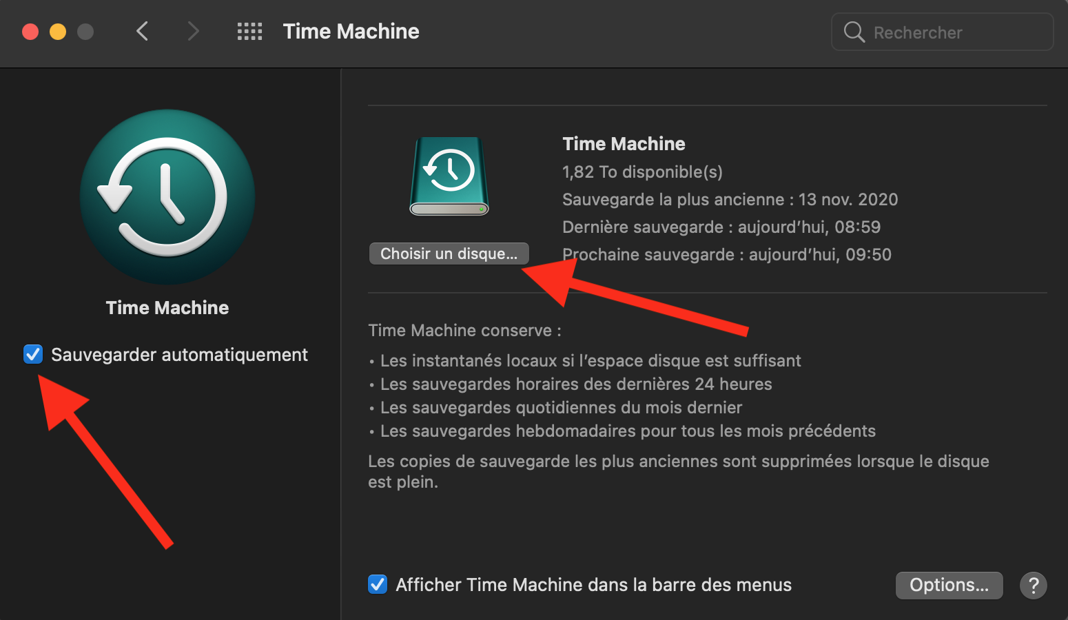 Un peu plus de précisions, quel disque externe, format du disque, "Sauvegarder auto " est coché, et dans " Choisir un disque ", c'est le bon disque ?