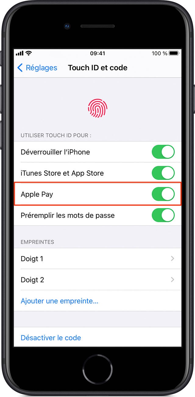 Pour cela, il faut aller dans l'application "Réglages" de ton iPhone, ensuite, clique sur "Touch ID et code", saisis le code de ton iPhone. Et maintenant désactive Apple Pay dans la rubrique "Utiliser Touch ID pour :".