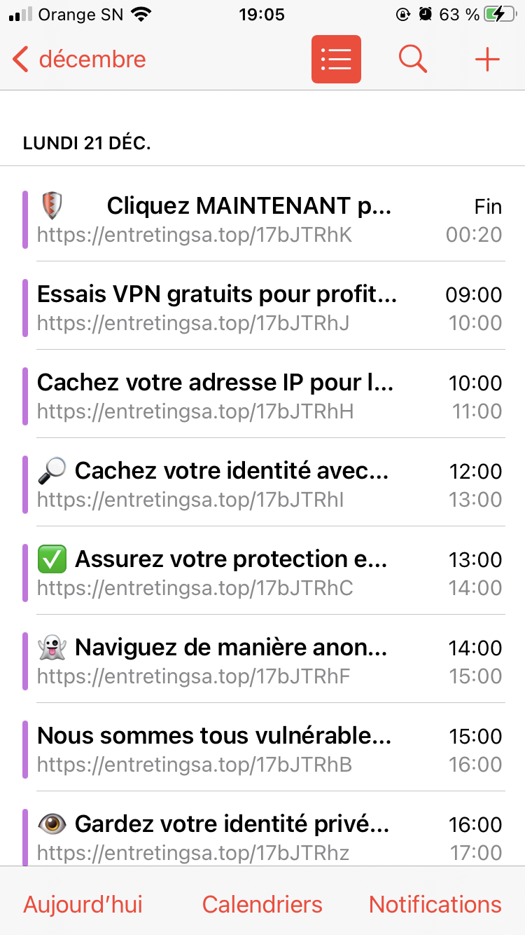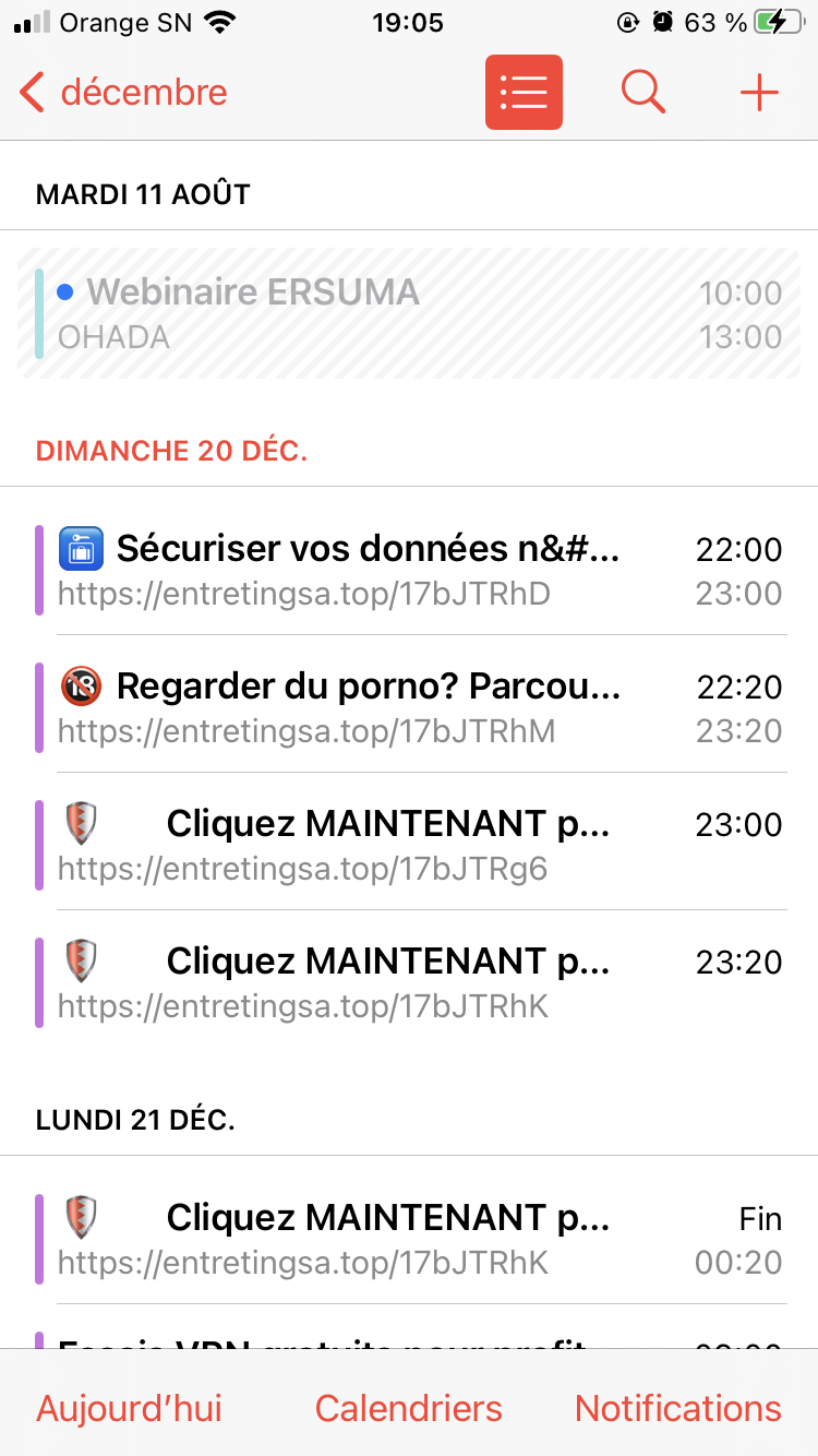 J’arrive à supprimer le virus dans mon calendrier. Svp aidez moi. En fait je suis parti faire de recherche sur Google ; par inadvertance j’ai cliqué là où je devrais pas cliquer ; ça m’a ouvert plusieurs pages. J’ai quitté les sites. Maintenant on a m’a envoyé des notifications sur mon calendrier ; des trucs bizarres ; des liens bizarres ; des événements créés jusqu’à le 22 de ce mois sans le savoir ; que j’arrive pas à supprimer depuis . Bref je pense que c’est un virus.s’il vous plaît aidez