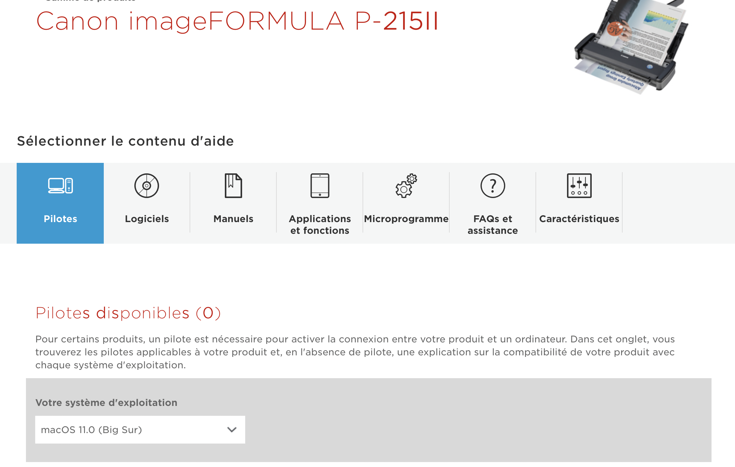 mon scanner canon image formula P 215 II n est pas reconnu par ma version Mac Big sur 11.1.