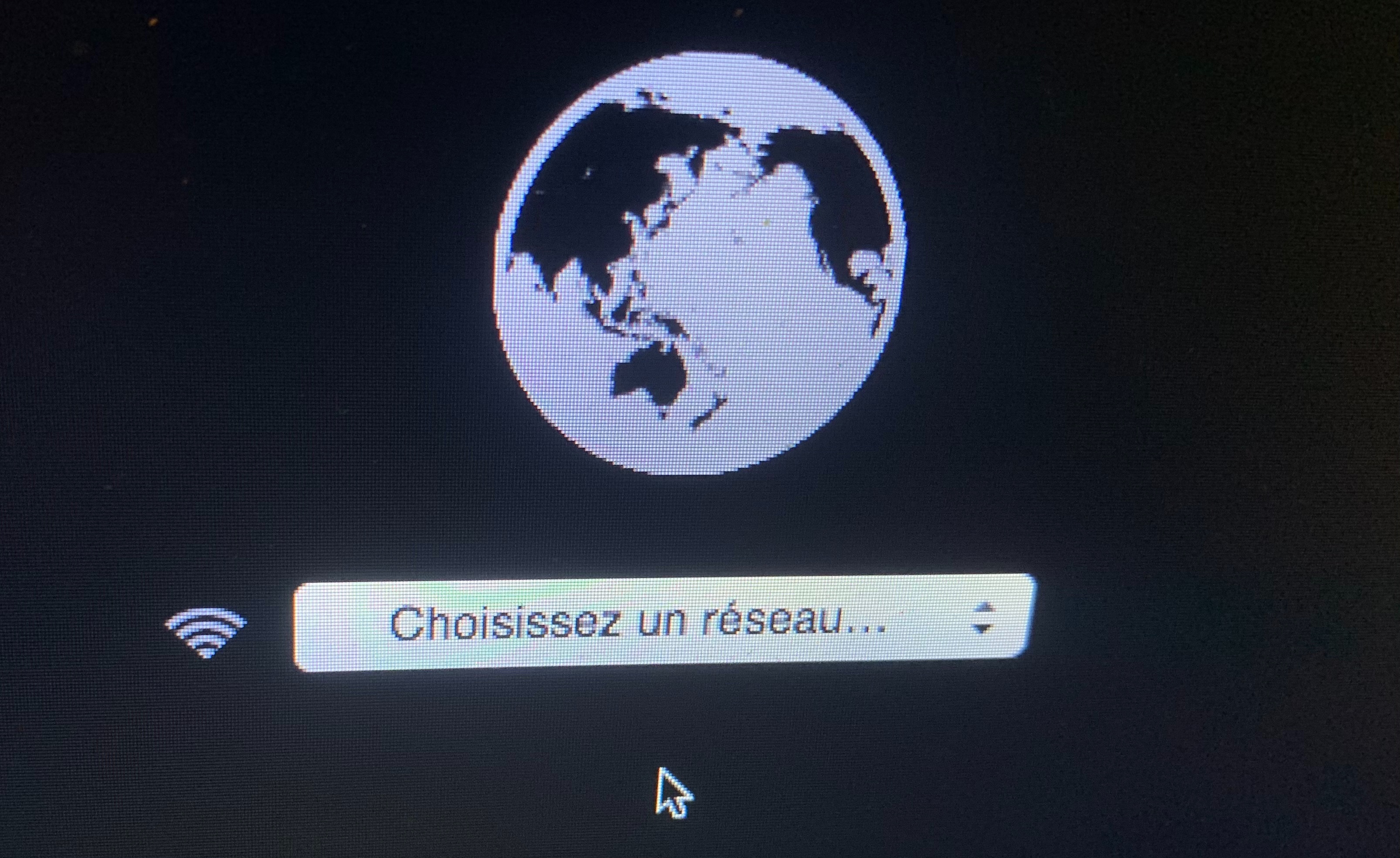 Lorsque je le rallume l’icône d’un dossier avec un point d’interrogation apparaît et clignote. Je le rallume donc avec CMD + R ce qui lance le Internet Recovery Mode. Au passage, tout les raccourcis Alt + Cmd + R ou bien Shift + Alt + Cmd + R font exactement la même chose. Un globe apparaît et l’on me dit que la récupération par internet peut prendre un certain temps. On me demande de me connecter à mon réseaux wifi, j’entre mon mot de passe, une icône de chargement apparaît mais au bout d’un certains temps on me redemande le mot de passe, comme si celui que j’ai entré était faux. (Ce qui n’est pas le cas). J’ai essayé en étant tout près de la box, j’ai vérifié ma connection internet sur d’autres appareils mais rien ne change.