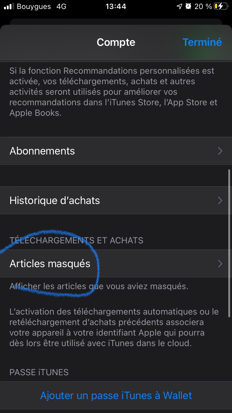 Dans téléchargements et achats, "Gérer" les articles masqués