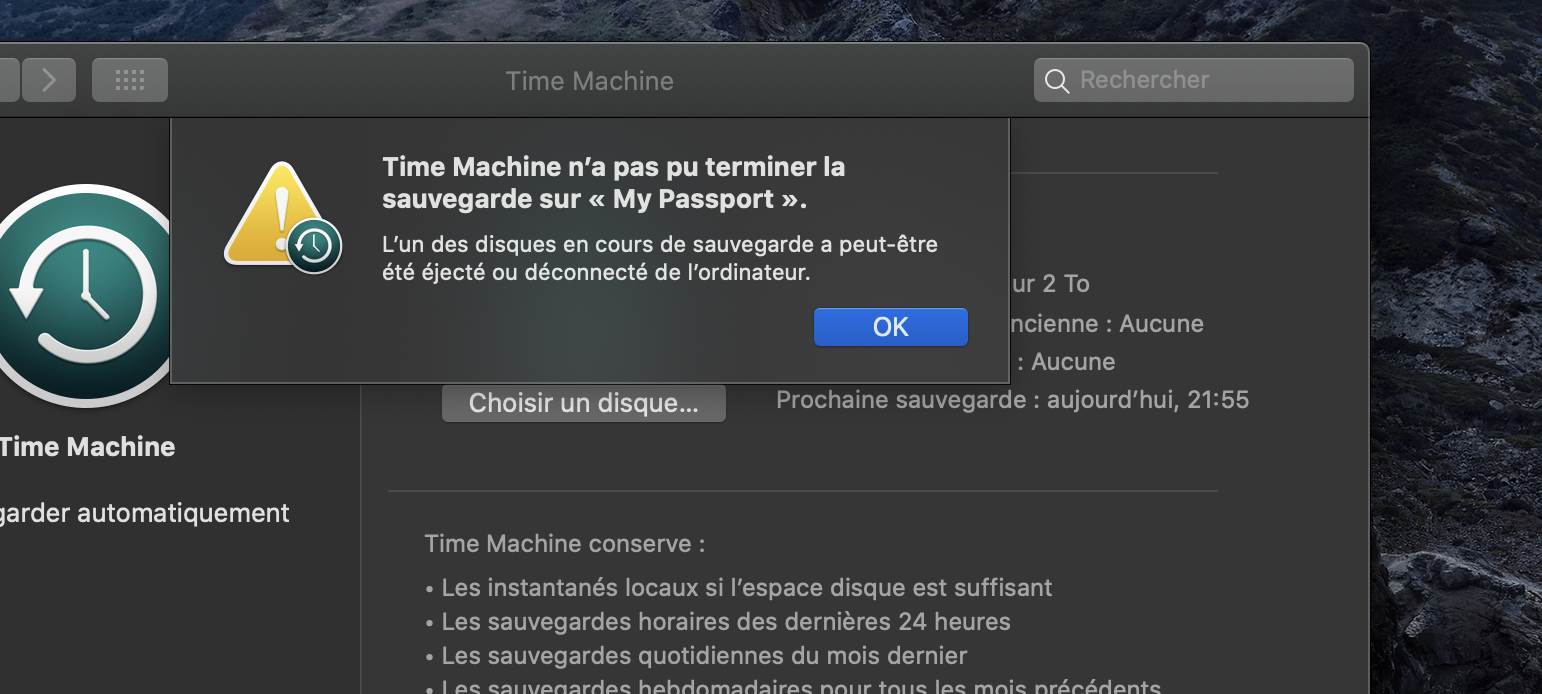 j'ai un probleme de sauvegarde time machine, qui s'arrete