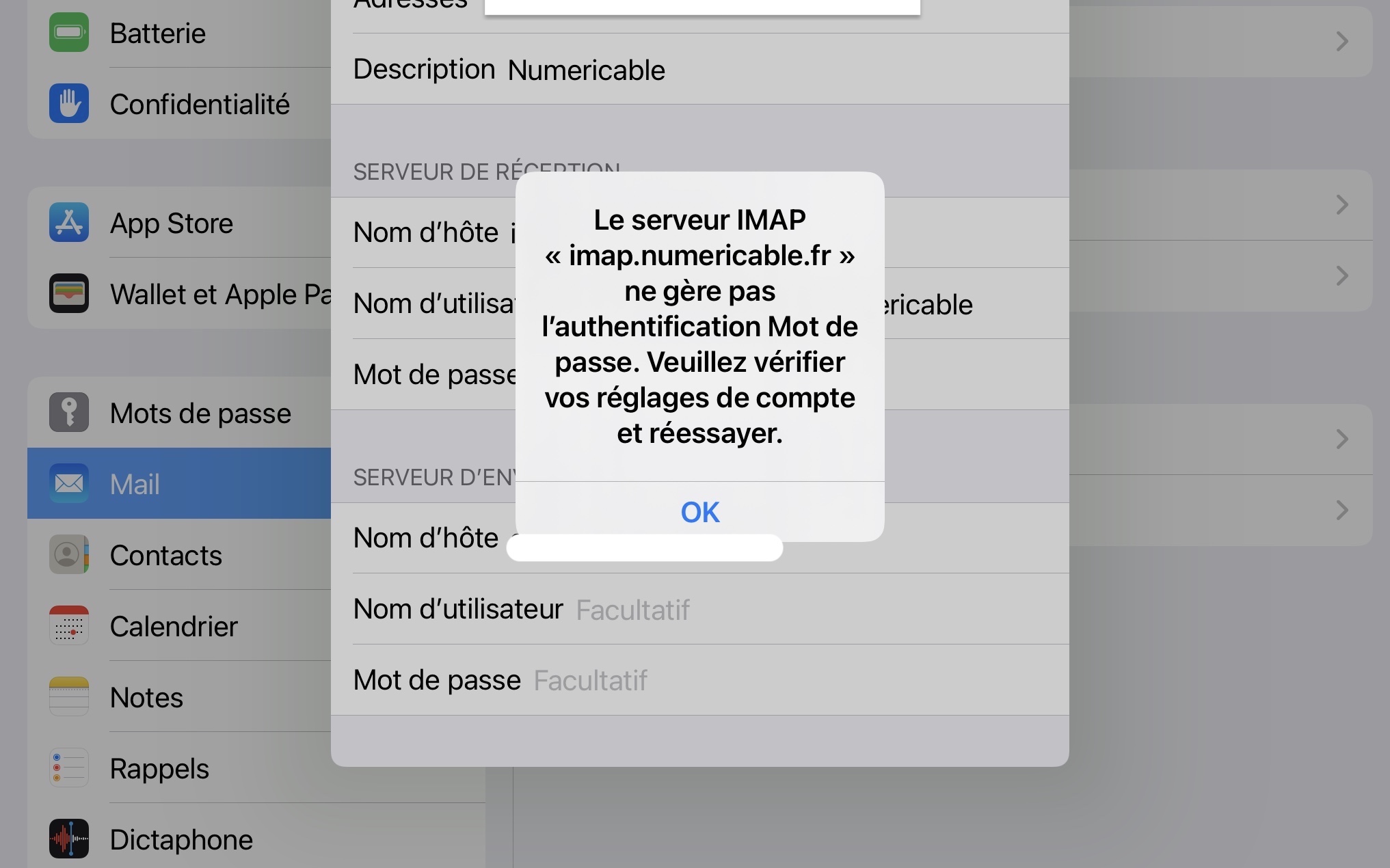 Cela provient de mauvais paramètres entrés lors de la configuration de votre adresse et non d’un problème lié à votre iPad. Voici un lien vous présentant les paramètres à saisir :