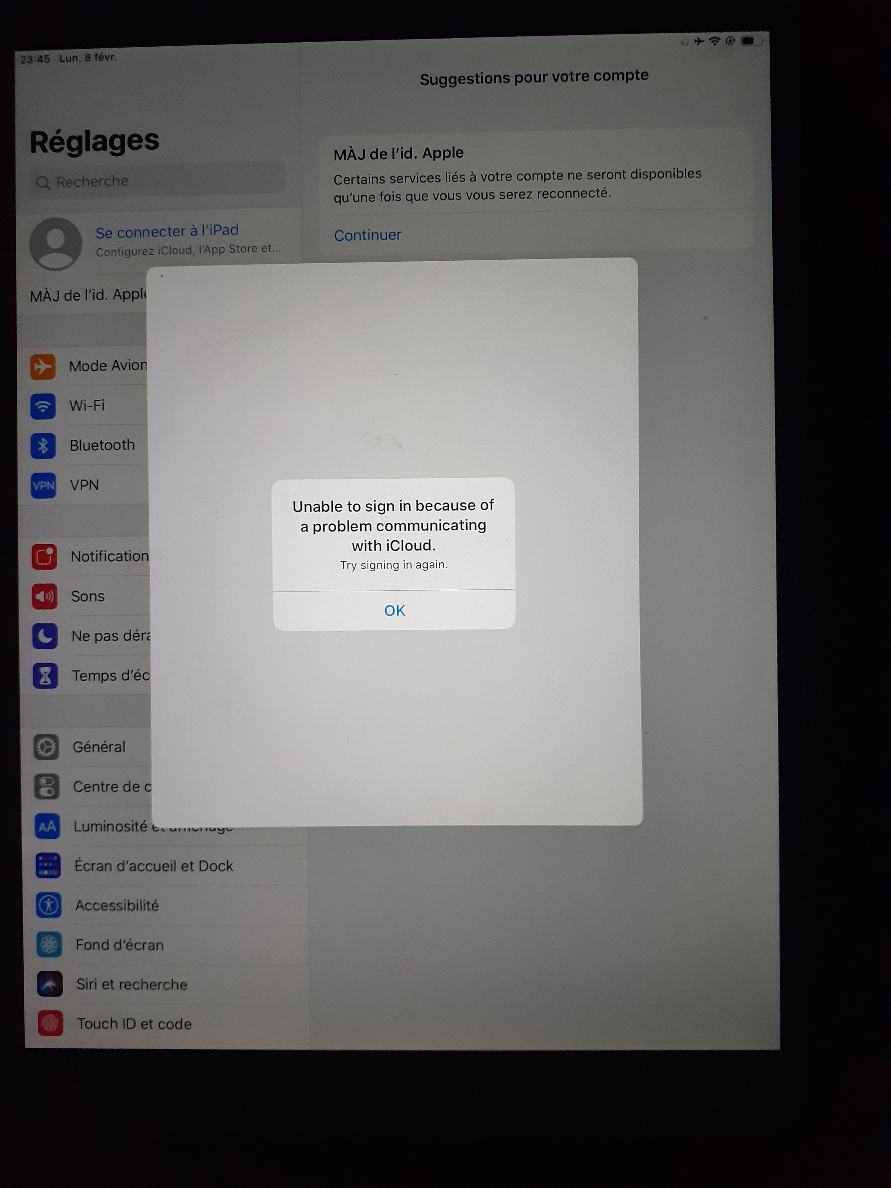 J'arrive pas à me connecter sur mon compte iCloud dans mon ipad
