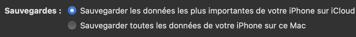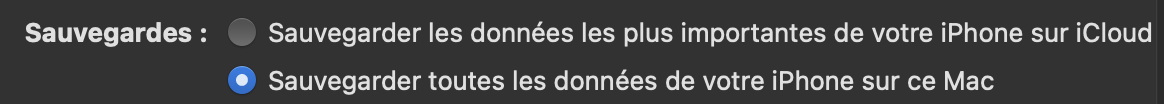 Cependant sur mon Mac, dans le Finder, je clique à chaque fois sur "Sauvegarder les données les plus importantes de votre iPhone sur iCloud" mais cela revient quelques secondes plus tard sur "Sauvegarder toutes les données de votre iPhone sur ce Mac".