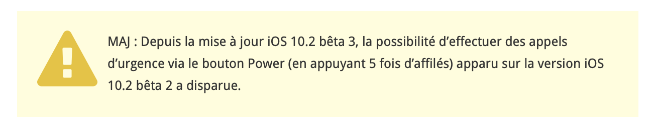 Pourtant, j'ai vu que la fonction Appel d'urgence était apparue sur iOS 10.2 (le tel est en 10.3). Ce qui est étrange d'ailleurs, c'est qu'il devrait normalement y avoir un menu dédié dans les Réglages / Général / Appel d'urgence mais il n'est pas présent.