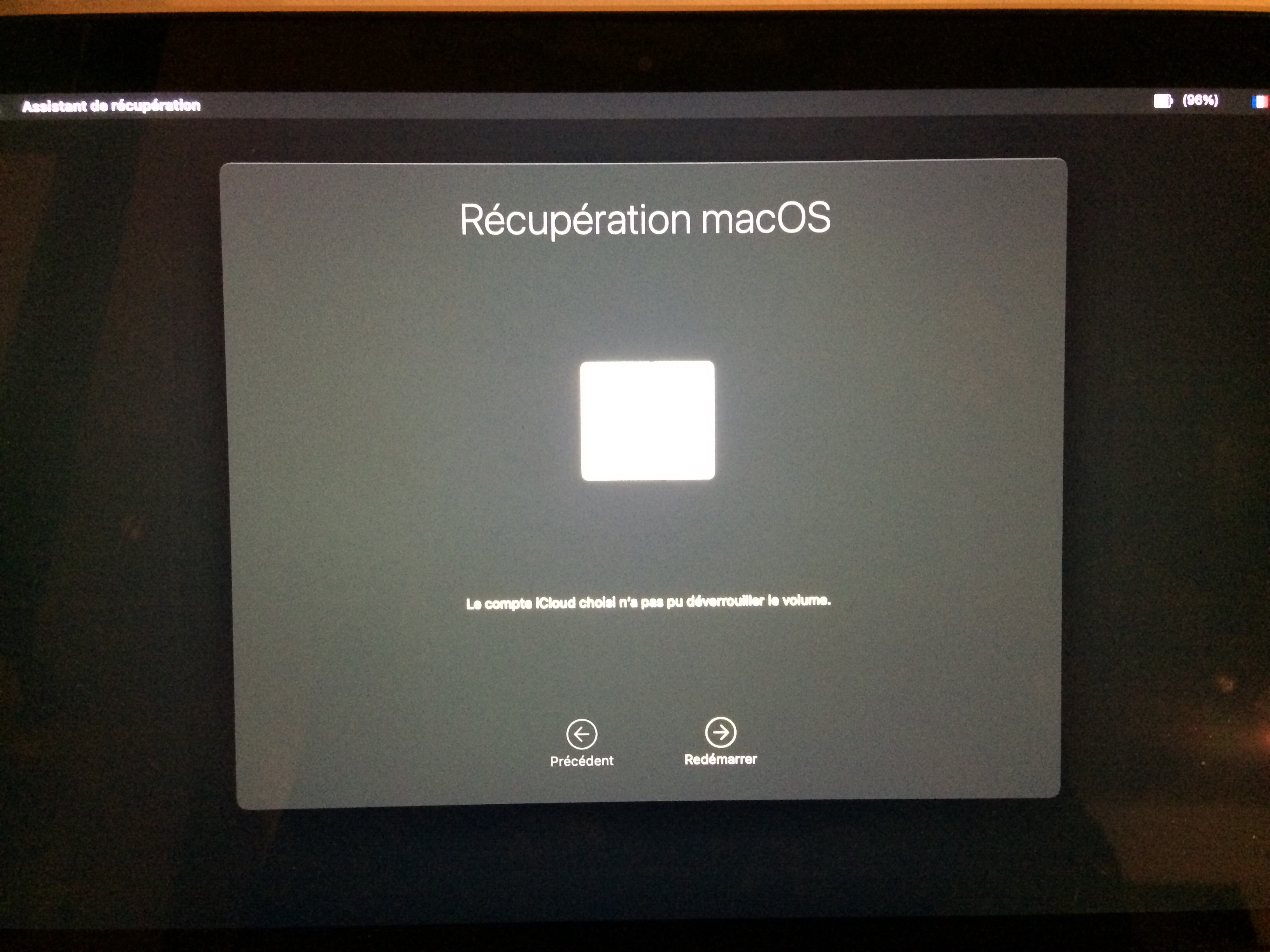 En faisant mot de passe oublié, et tentative de connexion avec identifiant apple, un message d’erreur s’affiche « le compte icloud choisi n’a pas pu déverrouiller le volume »