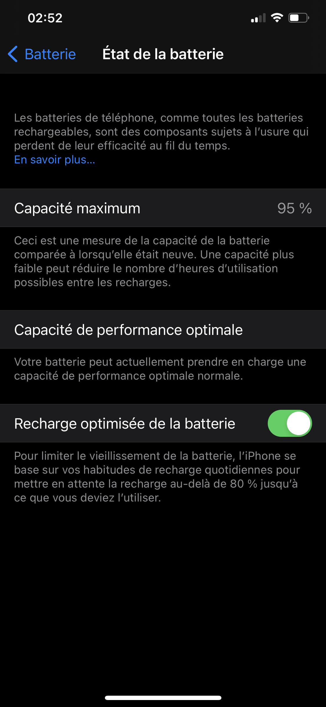 Je constate que vous avez activé la recharge optimisée, c'est parfait, votre iPhone va apprendre vos habitudes de charge et plus le temps passera, plus la charge (et donc l'usure) de votre batterie sera optimisée.