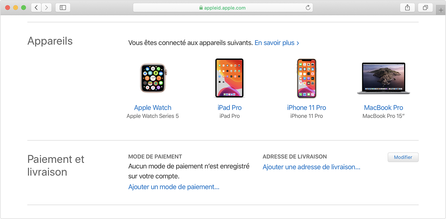 La section Appareils de la page de votre identifiant Apple contient la liste des appareils auxquels vous êtes actuellement connecté avec votre identifiant Apple :
