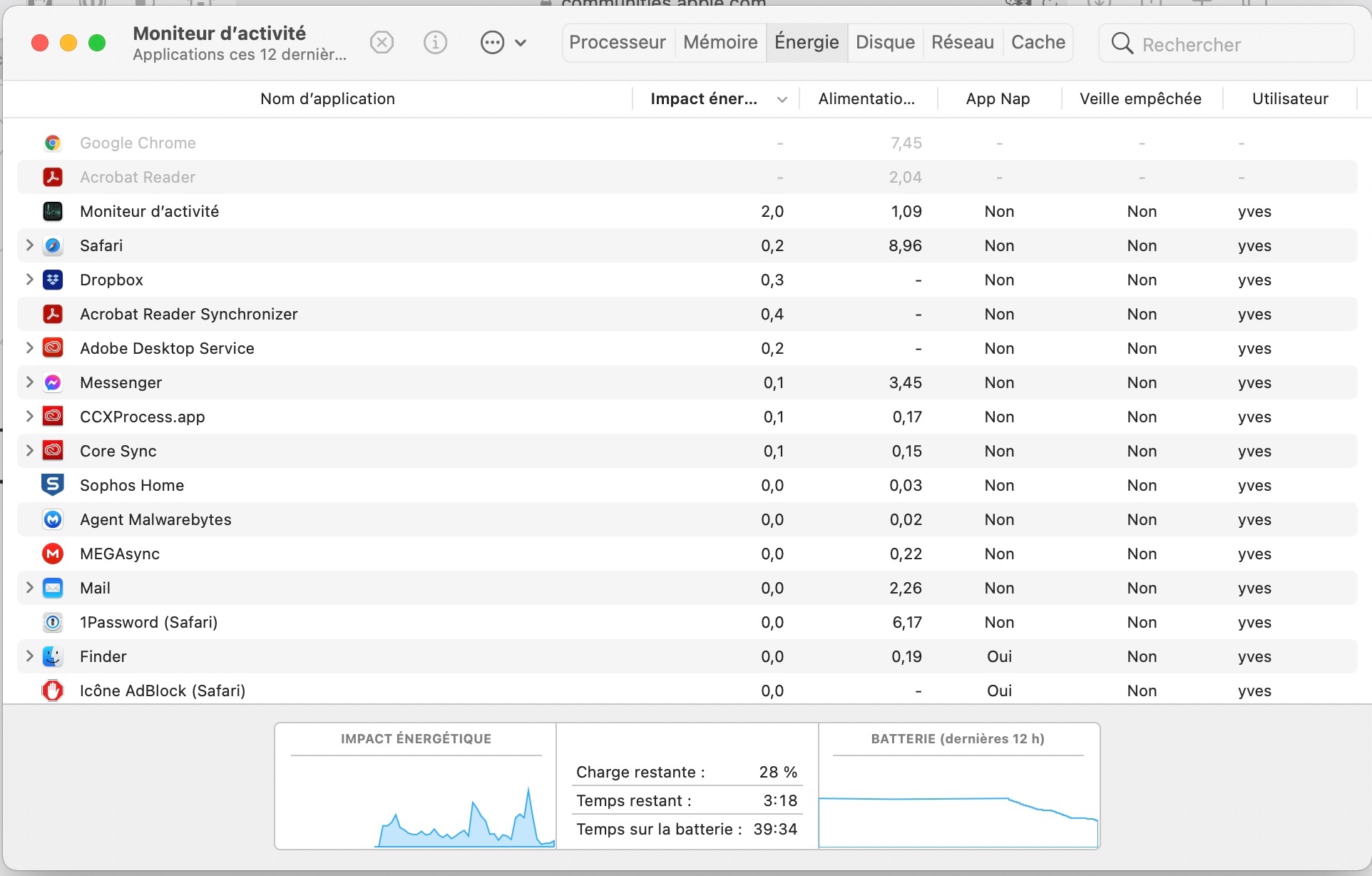 j'ai récemment fait l'acquisition de mon MacBook Air 13 M1 mais depuis quelque temps je remarque que la batterie se décharge très vite je passe de 100% a 85% en a peine 20min d'utilisation. je suis beaucoup sur safari qui consomme mais je trouve cela un peu fort. Pourtant au début je n'avais pas ce problème mais depuis la dernière MAJ je constate une baisse rapide de la batterie. Je ne joue pas à des jeux c'est plus bureautique mon utilisation