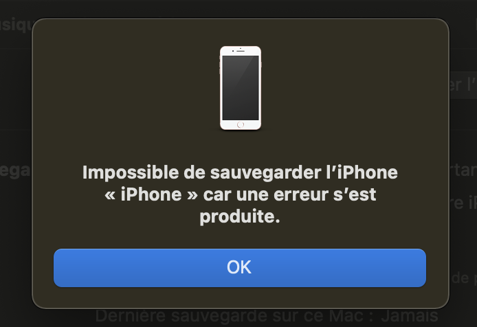 Je veux faire la sauvegarde de cet iPhone sur mon nouveau Mac (et non sur iCloud). Je connecte l'iPhone avec le câble USB. Il apparait dans la fenêtre Finder du Mac. Je clique sur "Sauvegarder maintenant" et un pop-up d'erreur apparait avec le message "Impossible de sauvegarder l'iPhone "iPhone" car une erreur s'est produite." (cf copie d'écran)...