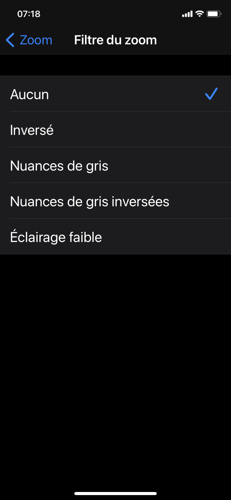 L’affichage de mon iPhone11 est passé soudainement en noir et blanc. En suivant la procédure indiqué sur le site Apple Réglages-Accessibilité-Affichage et taille du texte-Filtres de couleurs positionné sur « non », l’affichage en noir et blanc persiste.