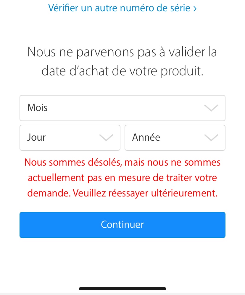 Merci. Mon problème est que lorsque je vérifie mes AirPods avec le numéro de série, je doit indiquer la date d’achat mais ça ne fonctionne pas.