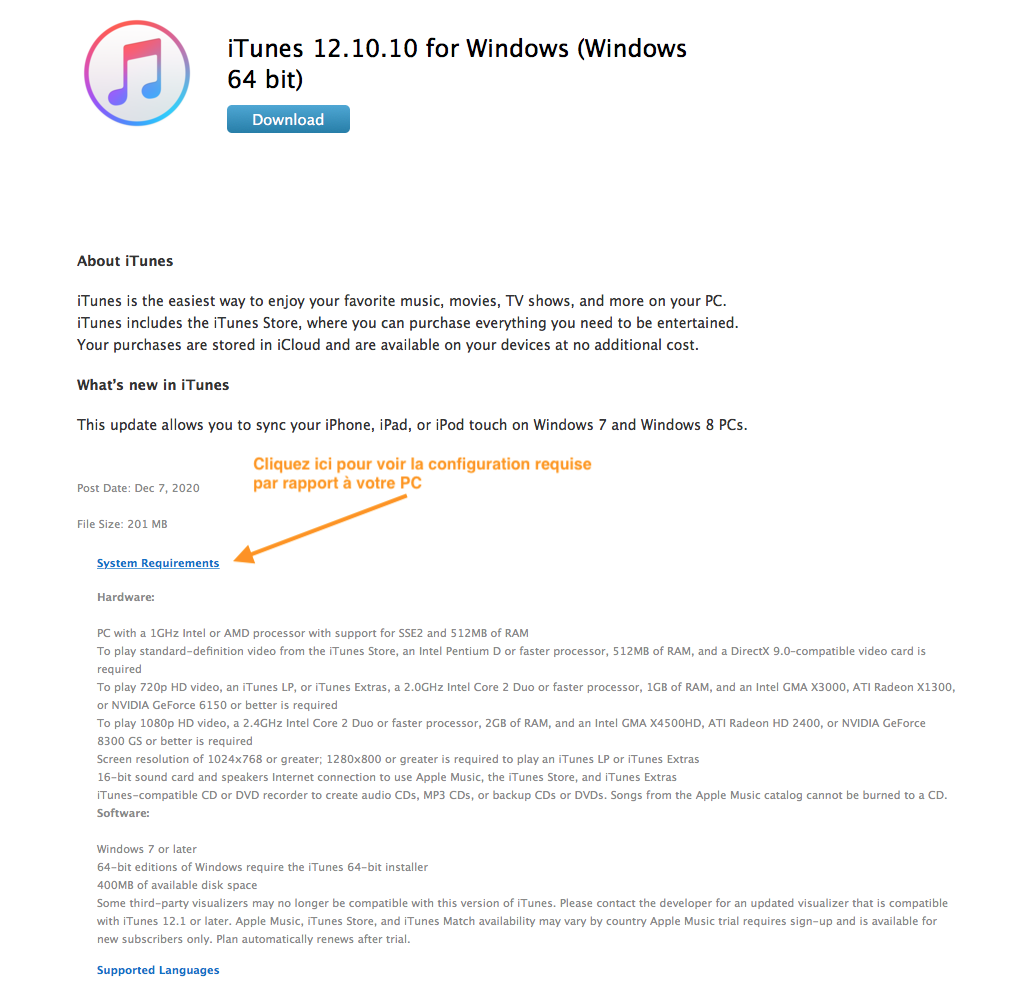 Impossible de trouver un iTunes qui fonctionne sur mon pc Windows 7 64 bit et iPhone 8
