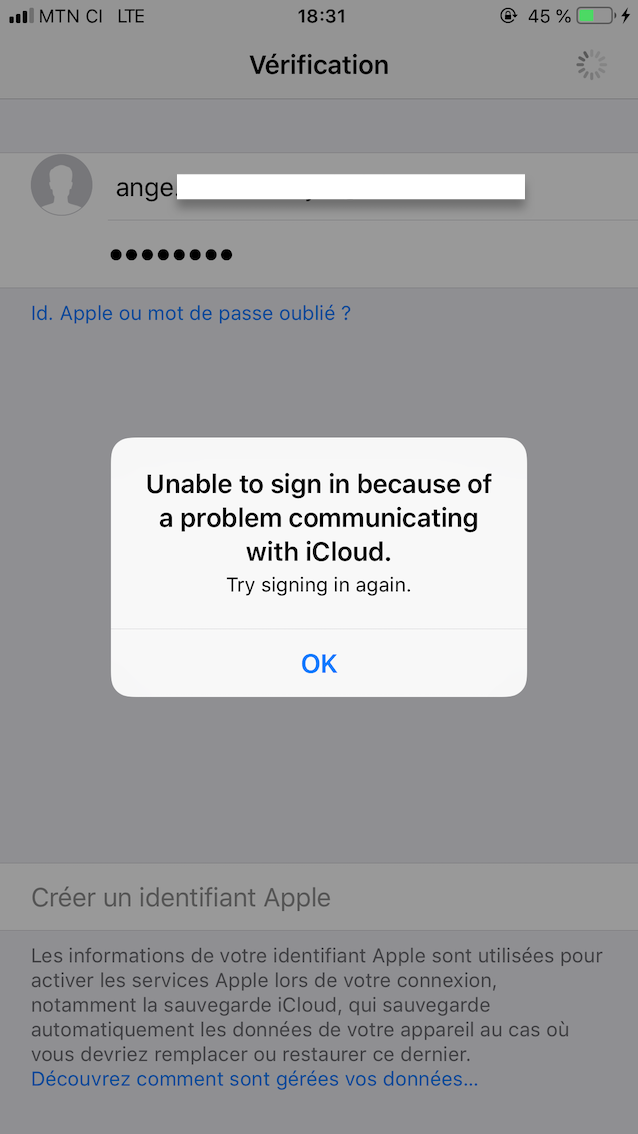 Je vois que tu es en connexion cellulaire pour connecter ton compte iCloud, essaie peut-être d'utiliser un réseau Wi-Fi pour tenter de nouveau l'opération. Autrement, tu peux suivre les instructions suivantes : Si vous ne parvenez pas à vous connecter à iCloud.