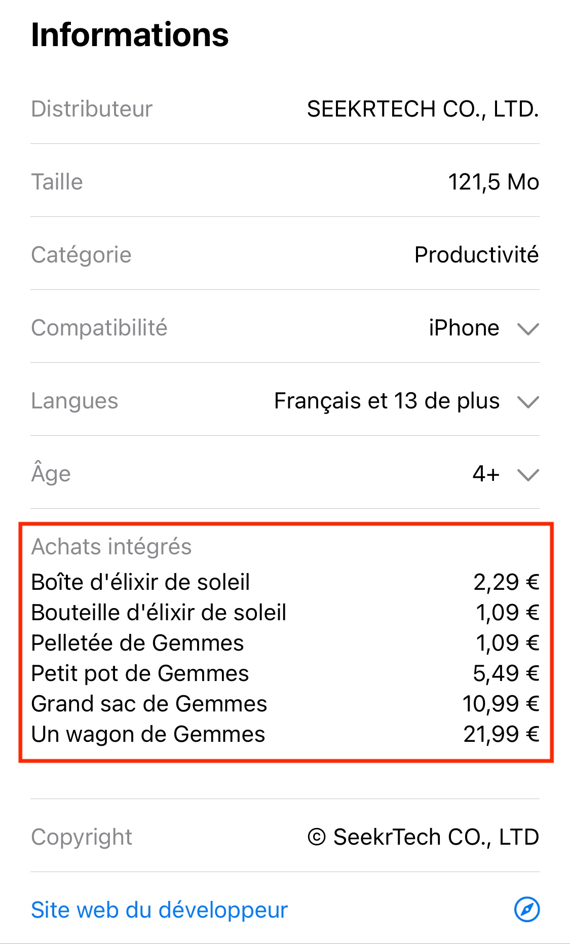 • les payantes : elles sont payantes au téléchargement (bouton avec un prix) et proposent ou non des achats intégrés