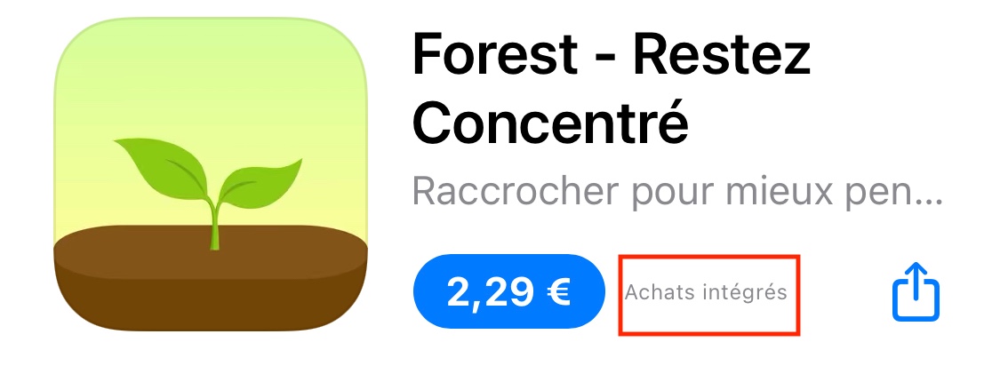 • les gratuites avec achats intégrés : elles sont gratuites au téléchargement mais possèdent des fonctions ou des bonus à acheter pour en améliorer l’expérience ou pour un abonnement (bouton « obtenir »)