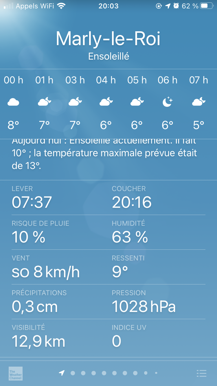 Hier soir j’ai fait la mise à niveau vers iOS 14.4.2 et aujourd’hui j’ai découvert un énorme bug dans l’app météo. Le ciel est bleu ciel alors qu’il fait nuit, il y a une heure qui a été supprimé et l’heure du coucher du soleil est indiqué 20:16 alors que le soleil est couché depuis 30 minutes. Comment on fait pour résoudre le bug ? Faut il repasser à la version antérieure ?