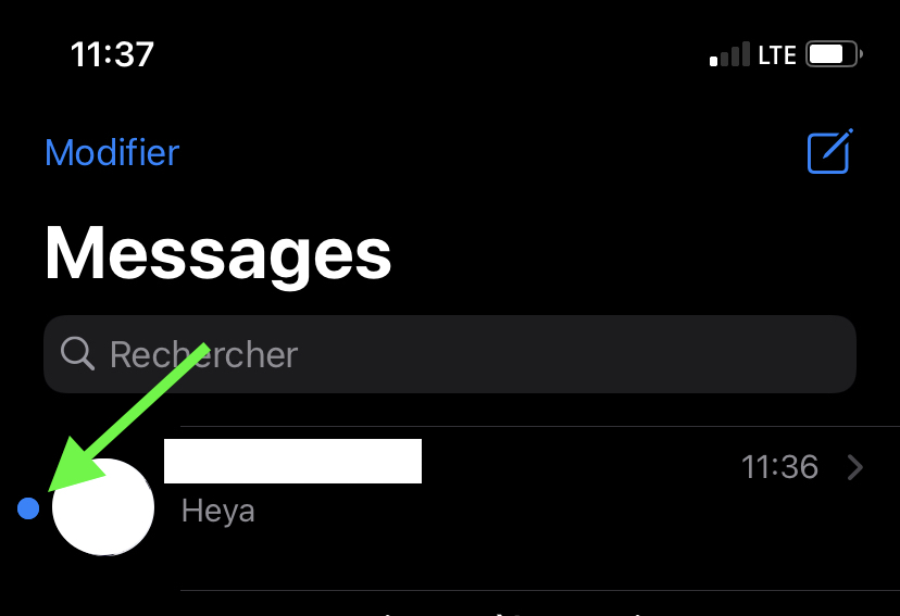 Point bleu à côté d'un contact dans iMessage sur iPhone