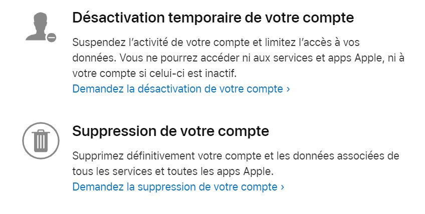 Vous aurez accès aux options de fermeture temporaire ou de suppression de compte :