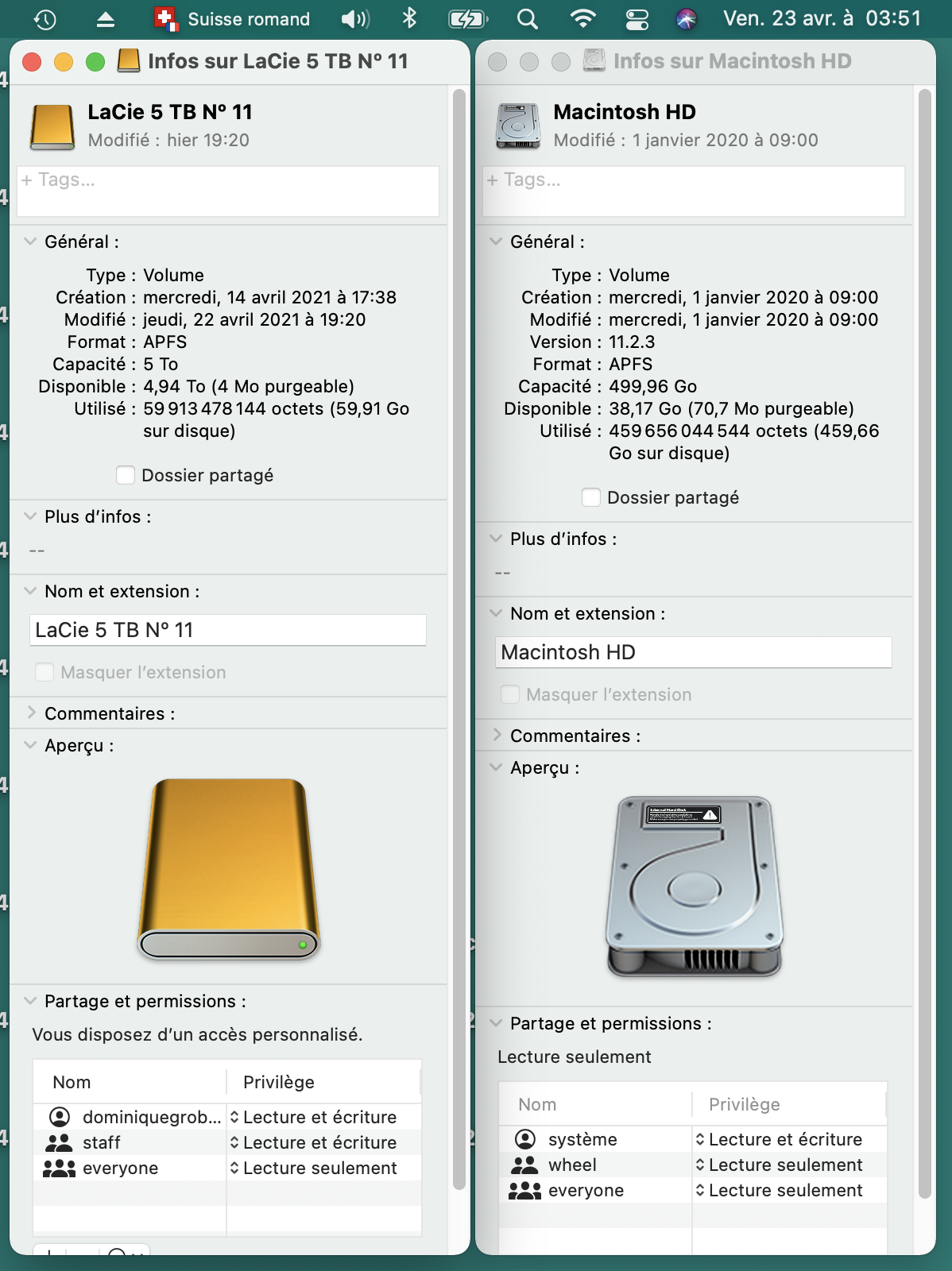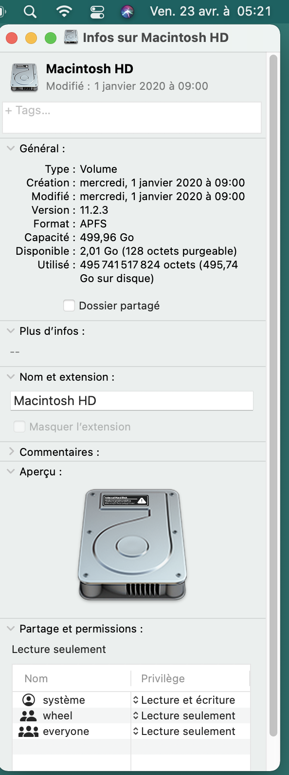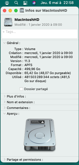 En copie les informations de mon disque SSD de 500 Go. Le "disponible" demeure autour de 65 Go, alors que j'ai près de 800 Go sauvegardé sur iCloud. De plus, il demeure env. 48 Go de purgeable.