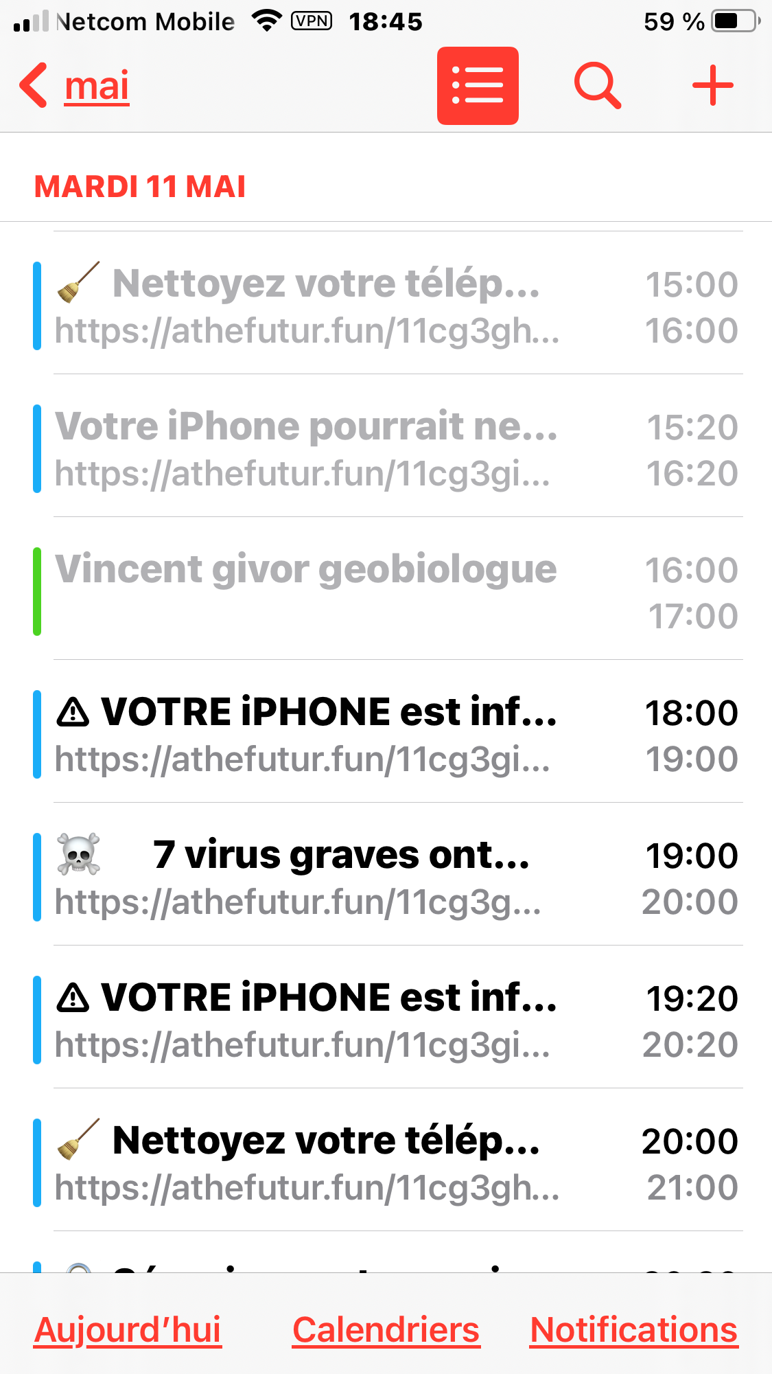 Bonjour, je suis infecté par un virus dans mon calendrier (voir ci-dessous) avez vous la solution ? Pour le supprimer. Merci à tous