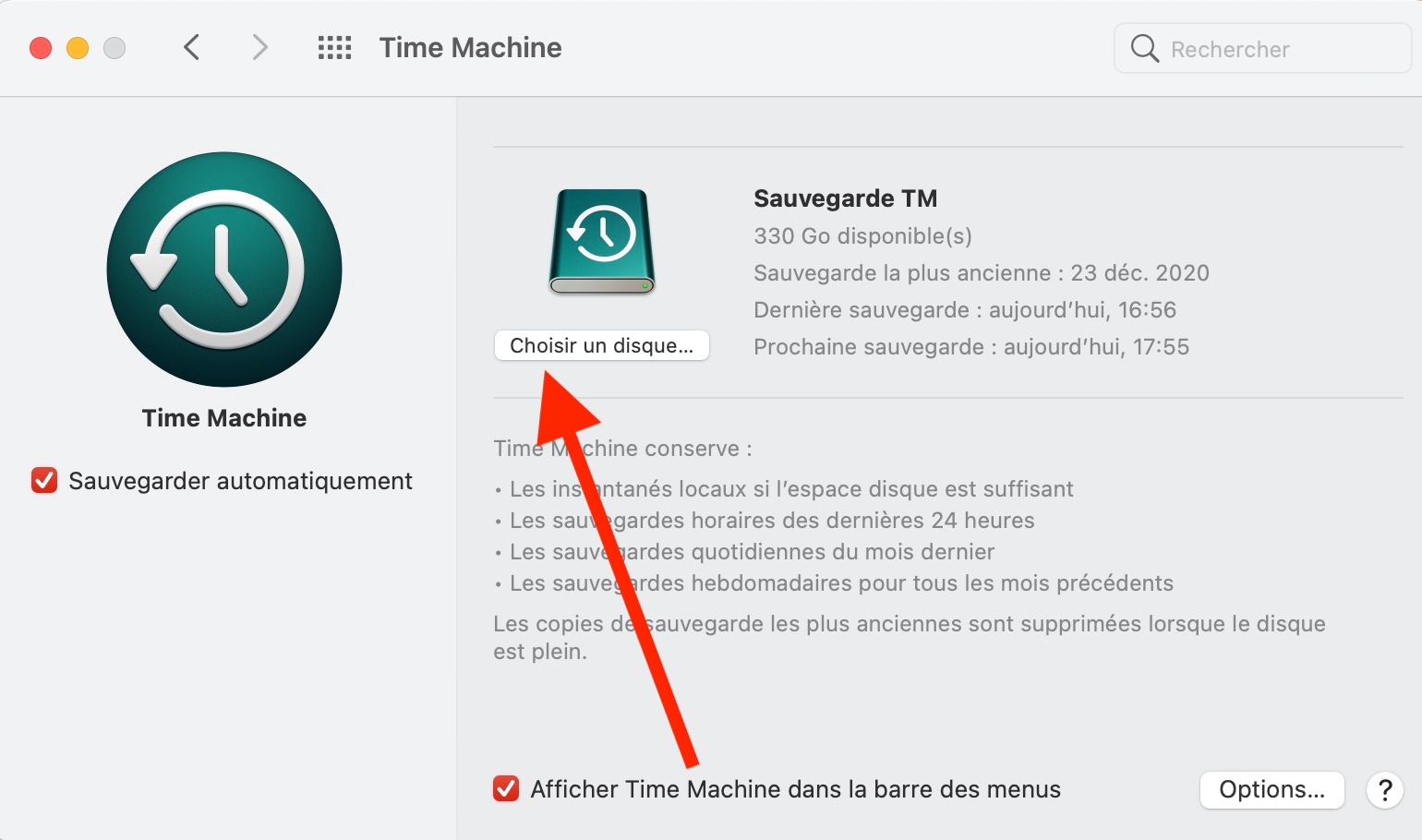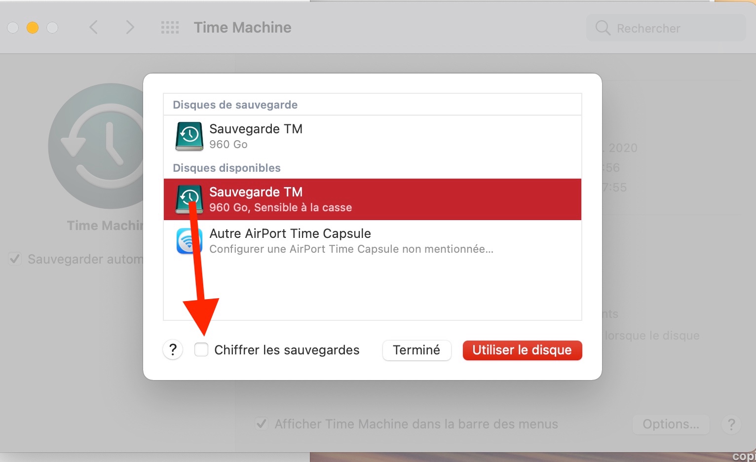 En branchant mon disque de sauvegarde Time Machine pour la première fois. J'ai pas coché la case '' chiffrement ''