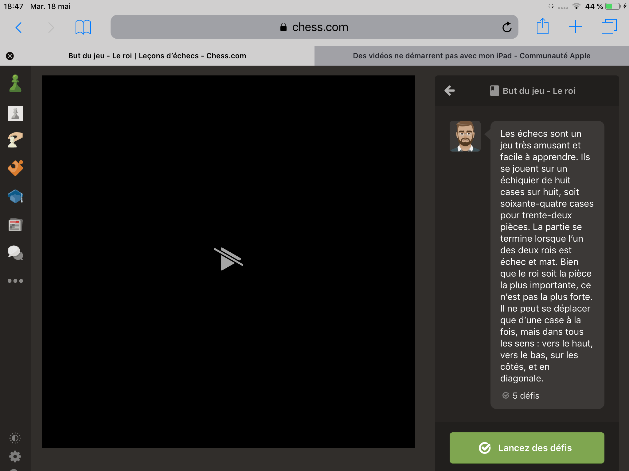 sur Chess.com, les vidéos de leçons d’échecs fonctionnent parfaitement avec Safari sur mon IMAC mais refusent de démarrer sur mon IPAD que ce soit avec Safari, Chrome, ou Firefox.