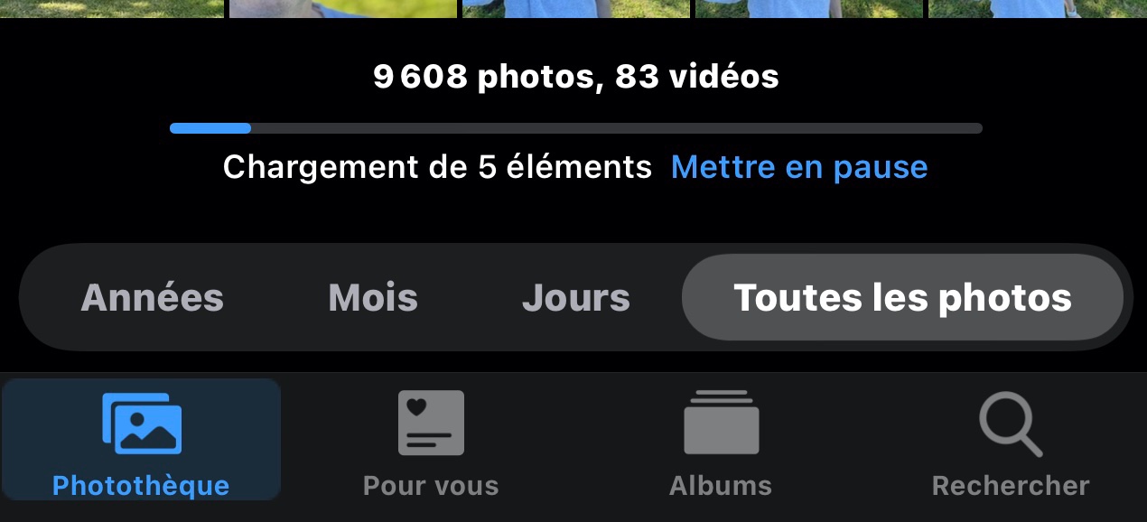 Photos voit bien qu'il y a 5 photos à transférer vers iCloud comme montré sur l'image jointe, mais la barre de progression n'avance pas, ni les chiffres.