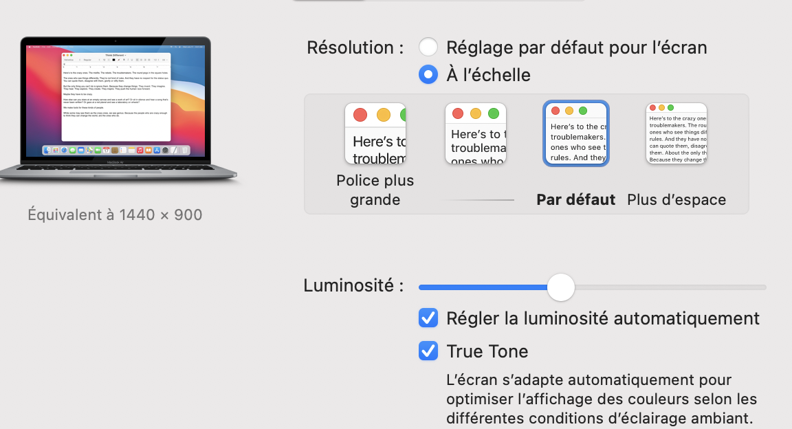 Savez-vous pourquoi les ordinateurs Apple n'affichent pas la résolution par défaut de leurs spécifications? Que veulent dire les indications ci-jointes (équivalent à 1440 x 900) sur un MacBook Air censé avoir une résolution de 2560 x1600? C'est la même chose sur mon iMac 27 pouces, toutes proportions gardées. Merci pour vos lumières.