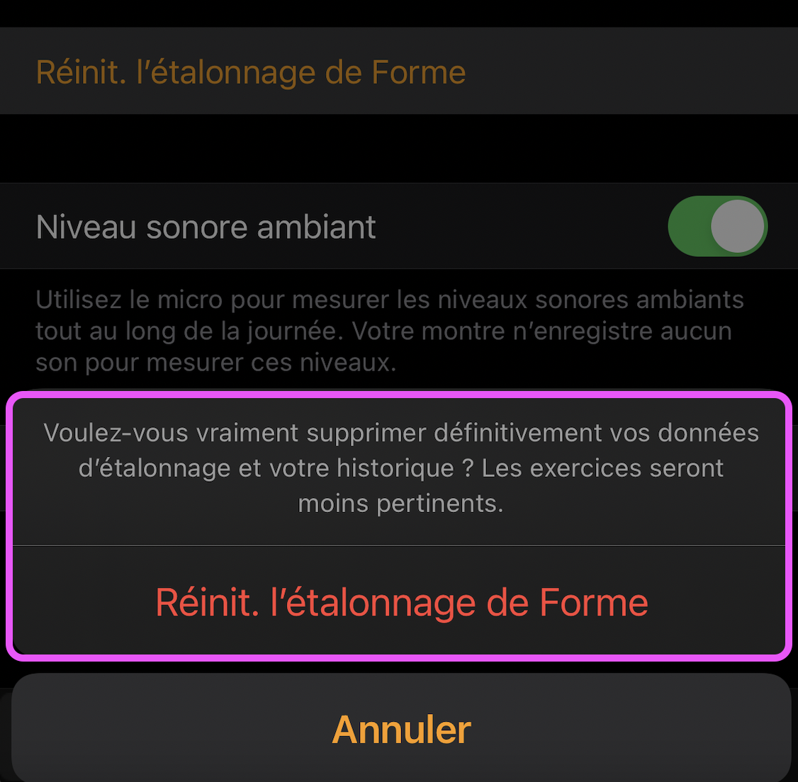 Réinitialisation de l'étalonnage de l'app Forme