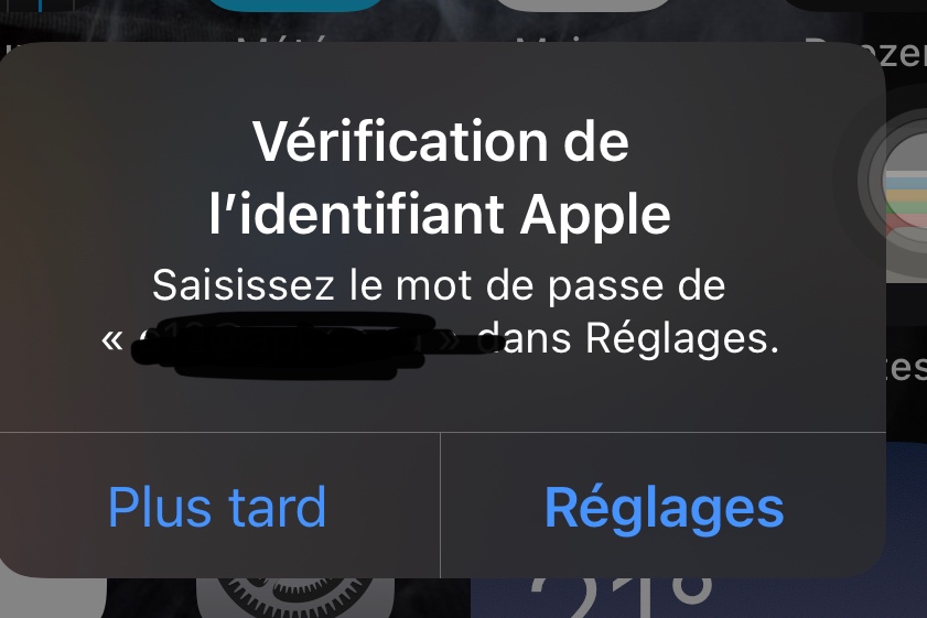 Il y a quelques mois, j'ai connecté mon iPhone sur un compte iCloud qui ne m'appartient pas, mon iPhone s'est donc associé avec ce compte. Mais maintenant je ne connait plus le mot de passe ce que compte et je ne peux pas contacter le propriétaire du compte (je m'en fou de ca), mais ce qui me dérange c'est qu'à chaque redémarrage du tel, j'ai une notif (voir photo) qui me demande de vérifié ce compte, mais sans mot de passe, bah je peux pas (donc je met "Plus tard" à chaque fois).