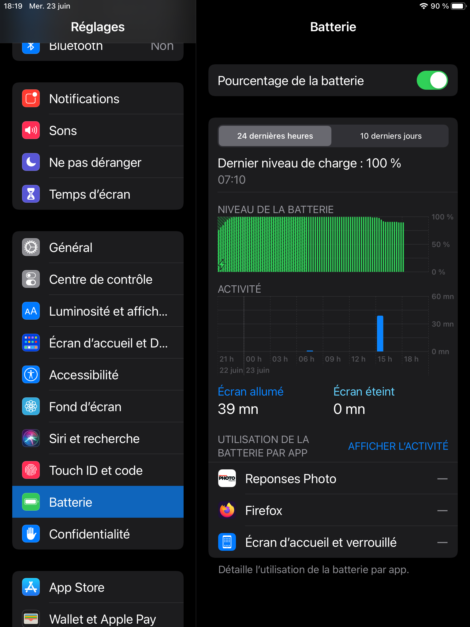 Pouvez-vous également poster ce que vous obtenez dans Réglages > Batterie?