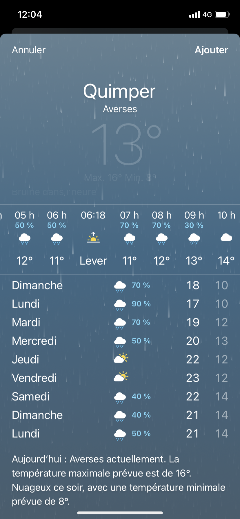 En prenant comme exemple la capture d'écran que vous nous avez fourni, il y a 70% de chance qu'il pleuve à 8:00 à Quimper.