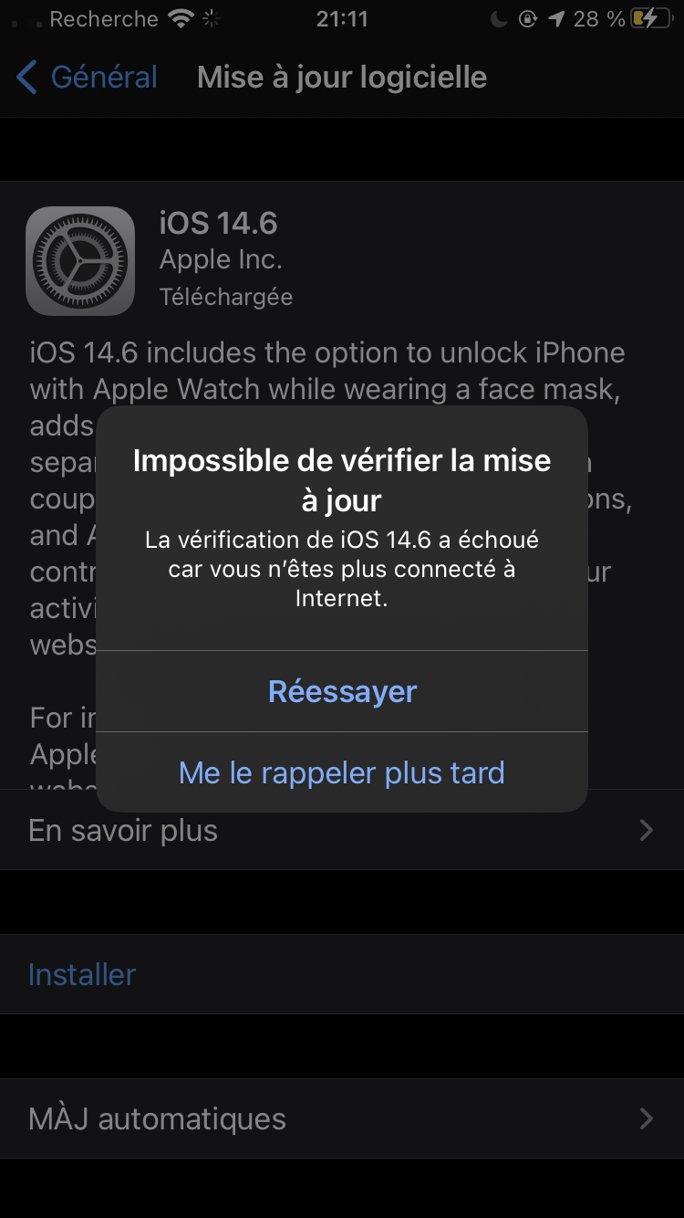 Bonjour !:) dès que j’essaye d’installer la Maj iOS 14.6, un message d’erreur apparaît me disant que « « mon appareil n’est pas connecté à internet donc la mise à jour est impossible à installer » alors que mon téléphone est bel est bien connecté à internet.