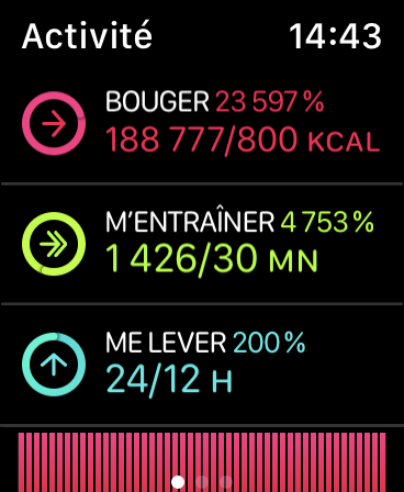 Bref, c'est assez curieux que ton Apple Watch te donne soudainement ce genre de challenge, un peu inatteignable, qui plus est. Il s'est passé quelque chose avant l'Apple Watch avant que ça n'arrive ? Une mise à jour ou l'installation d'une nouvelle app par exemple, voire une chute. Tout ce qui sort un peu de l'ordinaire, en fait.