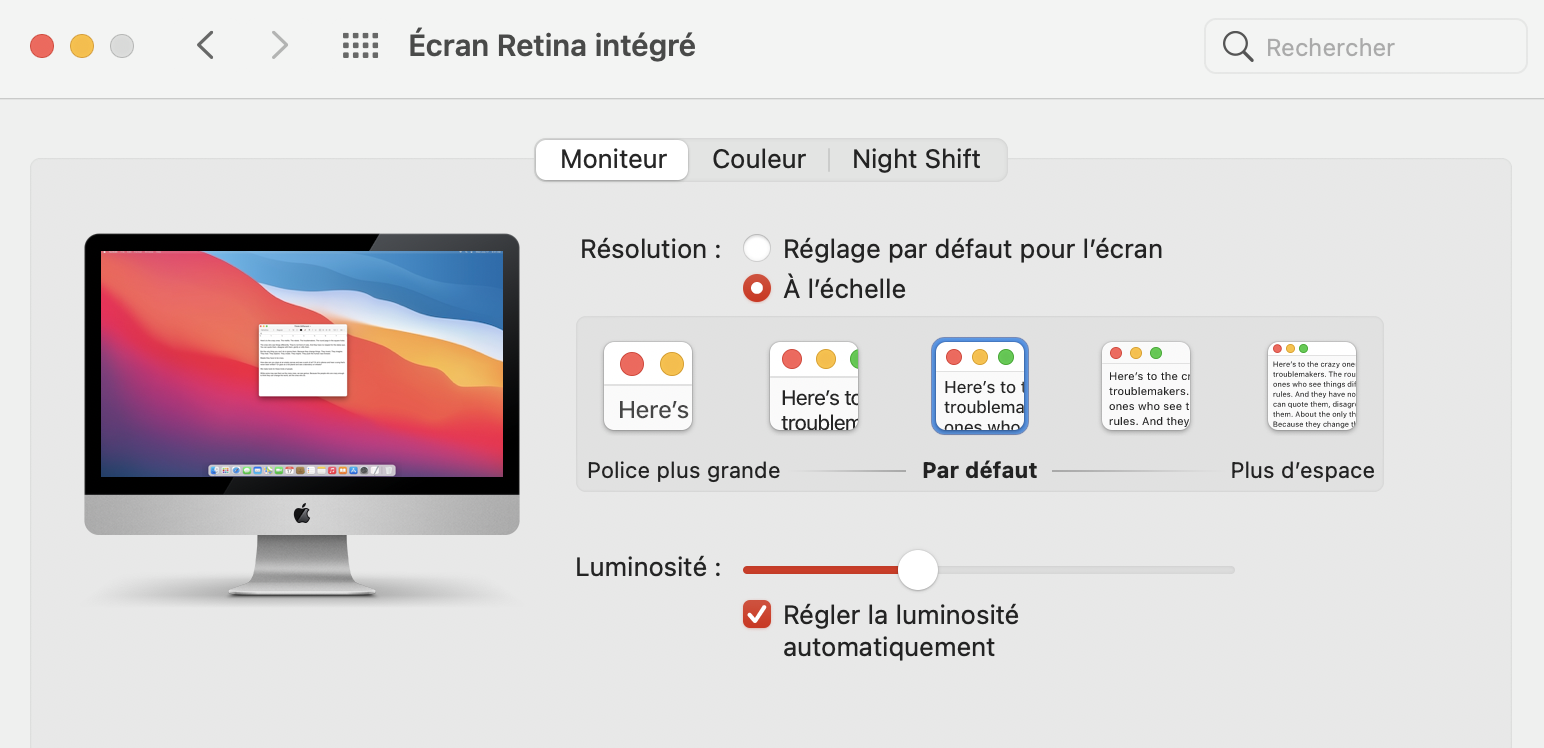 j'ai eu la chance de changer mon vieux Mac pro pour avec un 17" pour IMac 27 pouces mais je m'aperçois que la taille des caractères des menus des 2 fois plus petite que la taille des menus de mon 17 pouce...