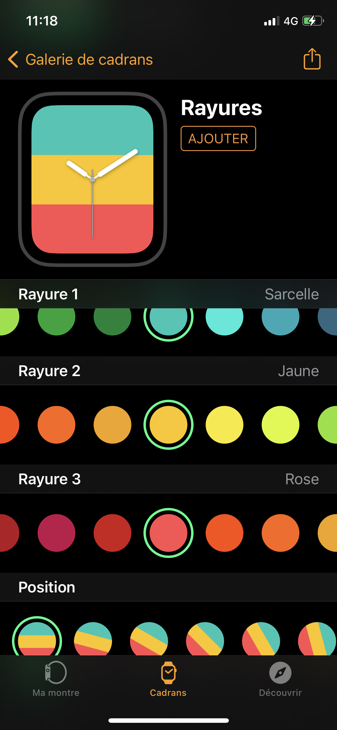 Sur votre iPhone, allez dans l’application Watch et dans l’onglet Cadrans. Vous avez une section « Rayures » et là vous pouvez choisir vos couleurs (bleu blanc rouge dans votre cas).