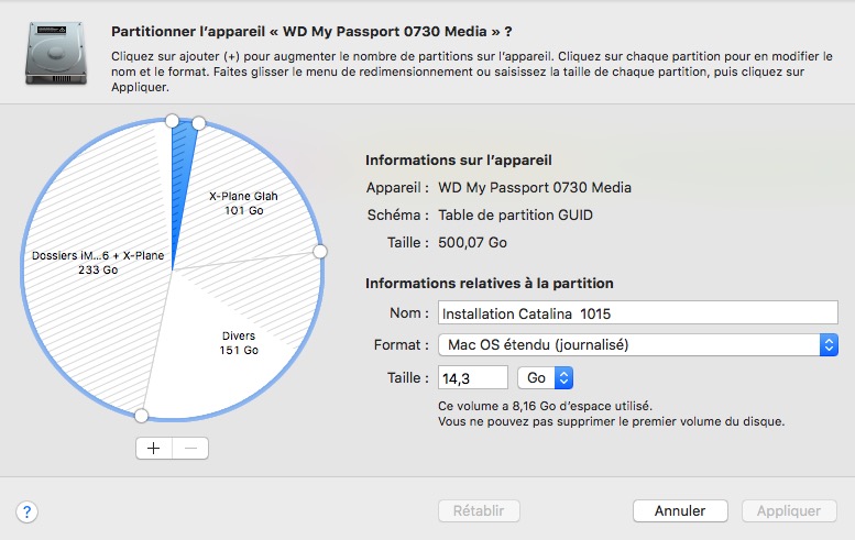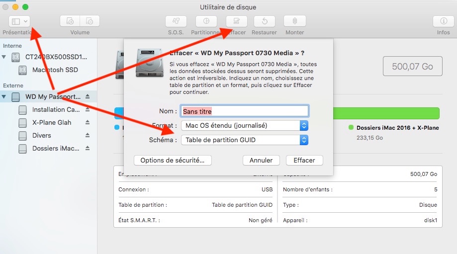 1- Quand je suis dans l'utilitaire de disque, je peux choisir le format (Mac OS étendu journalisé), mais il n'y a pas de choix pour la partition (GUID). Ce choix est recommandé dans plusieurs forums.