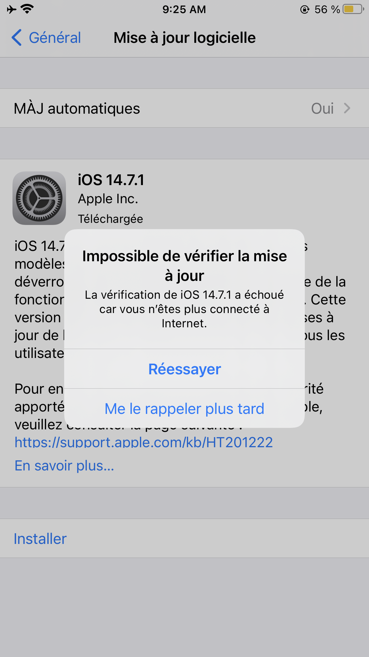 Mon wiffi est connecté mais mon iphone dit que l’iphone n’est pas connecté à internet pendant l’installation
