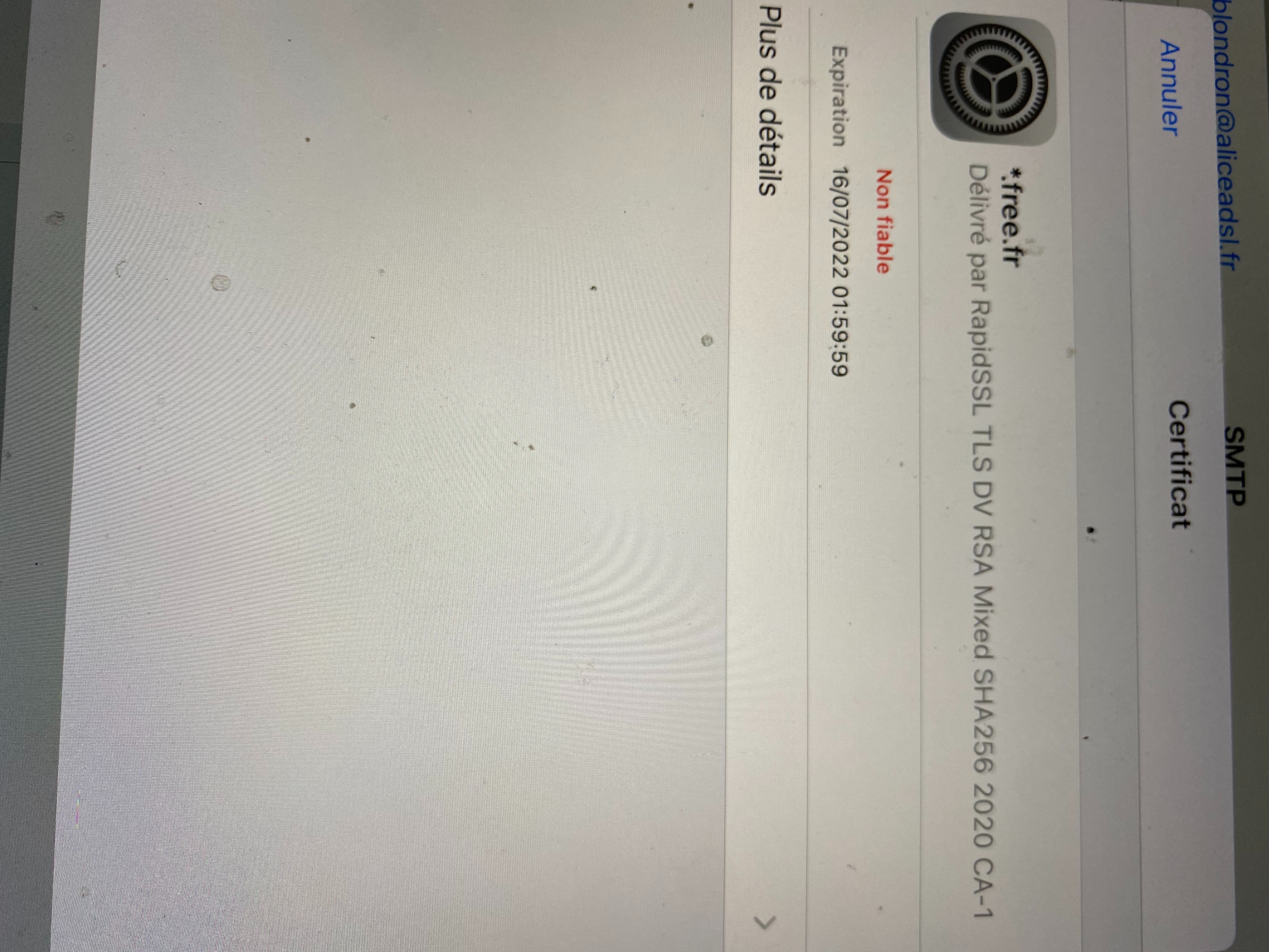 Bonjour ! J’ai un gros soucis sur ma boîte mail je peux lire mais je ne peux plus envoyer de mail depuis ma boîte Alice . Voilà ce qui apparaît . J’ai tenté plusieurs choses dont supprimer et réinstaller la messagerie mais rien y fait . L’iPad s’est mis à jour récemment , y aurait il un lien ?