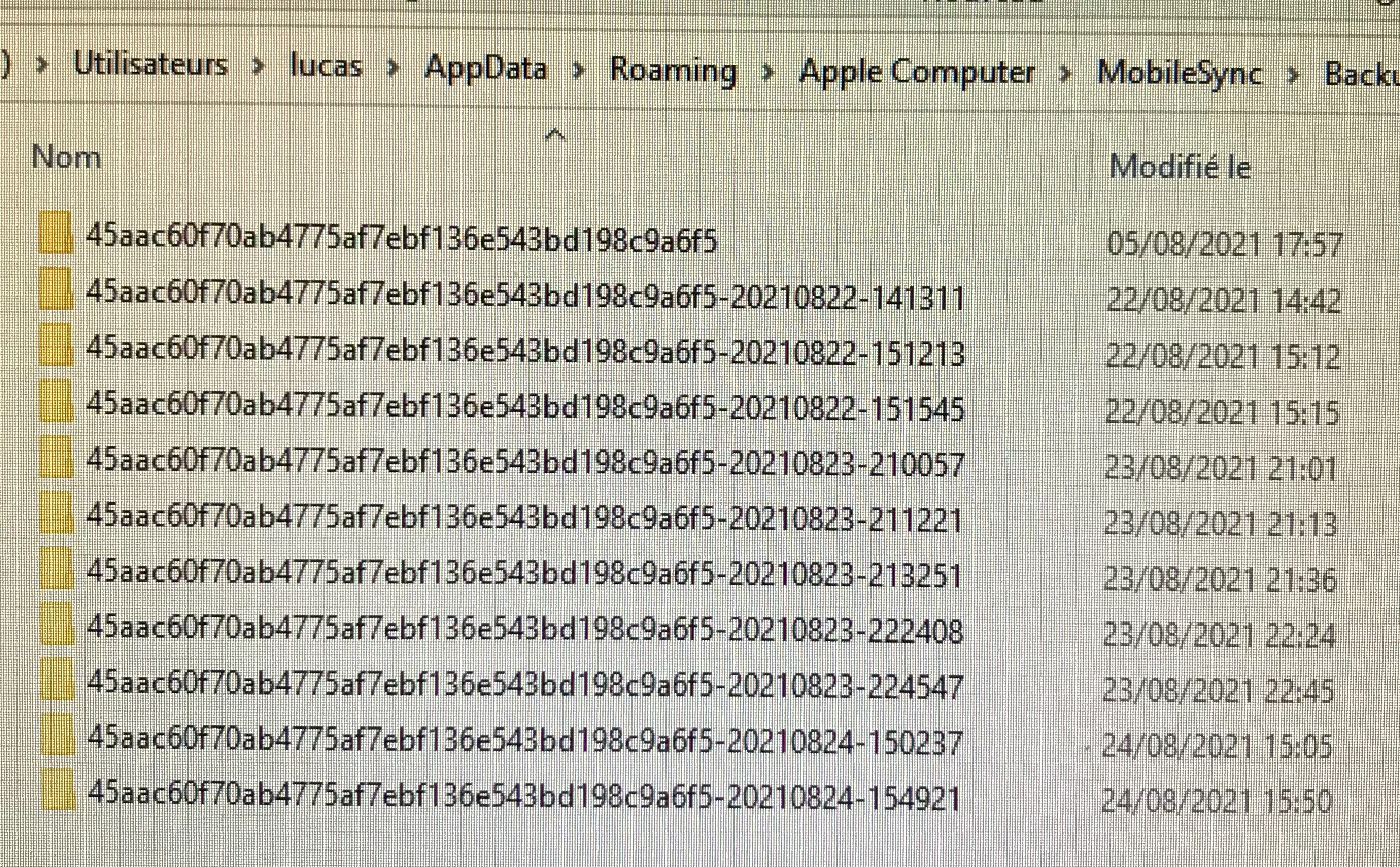 Question: puis-je effacer ces dossiers qu'Itunes crée a chaque tentative de restauration alors que le support d'Apple dit qu'il ne faut pas toucher au dossier Backup ? C'est en effet le seul moyen qu'il me reste pour liberer assez d'espace disque.