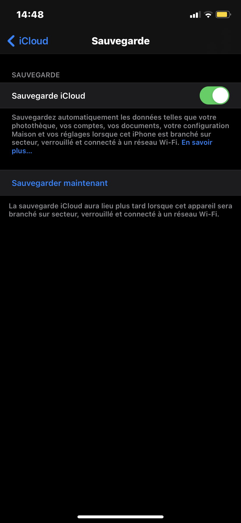 Je n’ai pas pu faire de sauvegarde sur mon iPhone depuis environ 1 an a cause d’un manque d’espèce de stockage. J’ai donc pris un abonnement 50 giga à 0,99€ par mois pour avoir davantage de stockage et effectuer une mise à jours ICloud. Malheureusement après de nombreux essaie je n’arrive toujours pas à faire de mise à jours, le temps estimé est de plusieurs heures, je l’ai donc laisse toute la nuit, mais le lendemain matin toujours le même temps estimer indique. Il y a également marqué qu’il faut se connecter à un réseau wifi sécurisé, alors j’ai essayé en étant connecté à mon wifi, puis à celui d’autre personne, mais toujours rien, pouvait vous m’aider ?