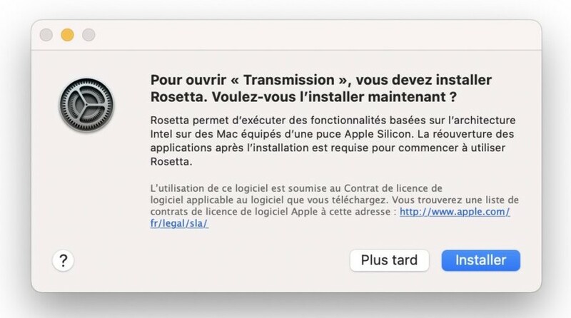 Si vous avez des applications Intel x86 installées sur votre nouveau Mac M1 Apple Silicon, le simple fait de lancer une application non native vous proposera d’installer Rosetta. En cliquant sur “Installer”, le logiciel Rosetta 2 sera alors installé sur votre Mac.