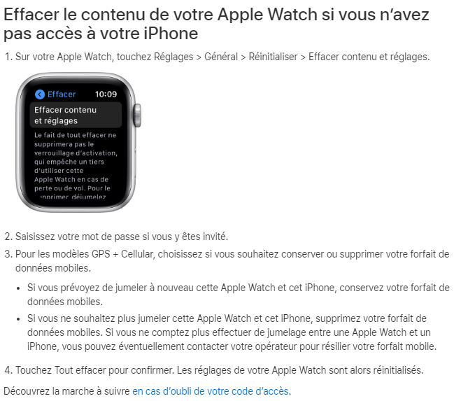 Oui je vois bien mais le pb et que lorsque je fais cette manipulation il y a un message sur ma montre comme quoi les données et réglage seront effacées => ok pas de pb, mais il marque aussi « à l’exception du verrouillage d’activation. Commencé par déjumelé l’Apple Watch avant de l’effacer . » c’est cette partie qui m’inquiète car le téléphone où était jumelé à la base l’Apple Watch est hs et je ne peux donc pas déjumelé la montre. Je ne voudrais pas qu’elle reste bloquée.