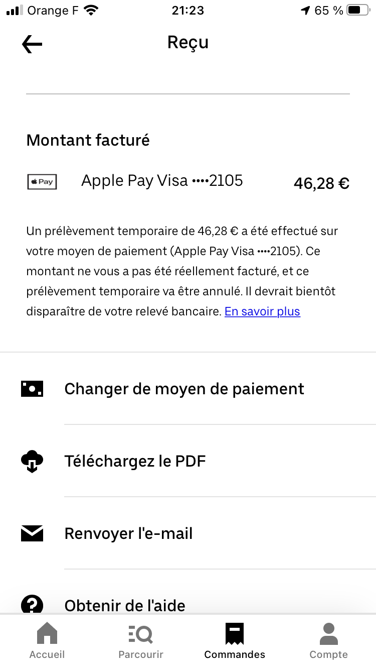 Aussi, je me suis rendue compte que les remboursements Uber Eat ne sont jamais arrivés jusqu’à mon compte bancaire. J’ai vérifié les reçus Uber et les 4 derniers numéros de carte/compte ont changés de numéro quelque fois.