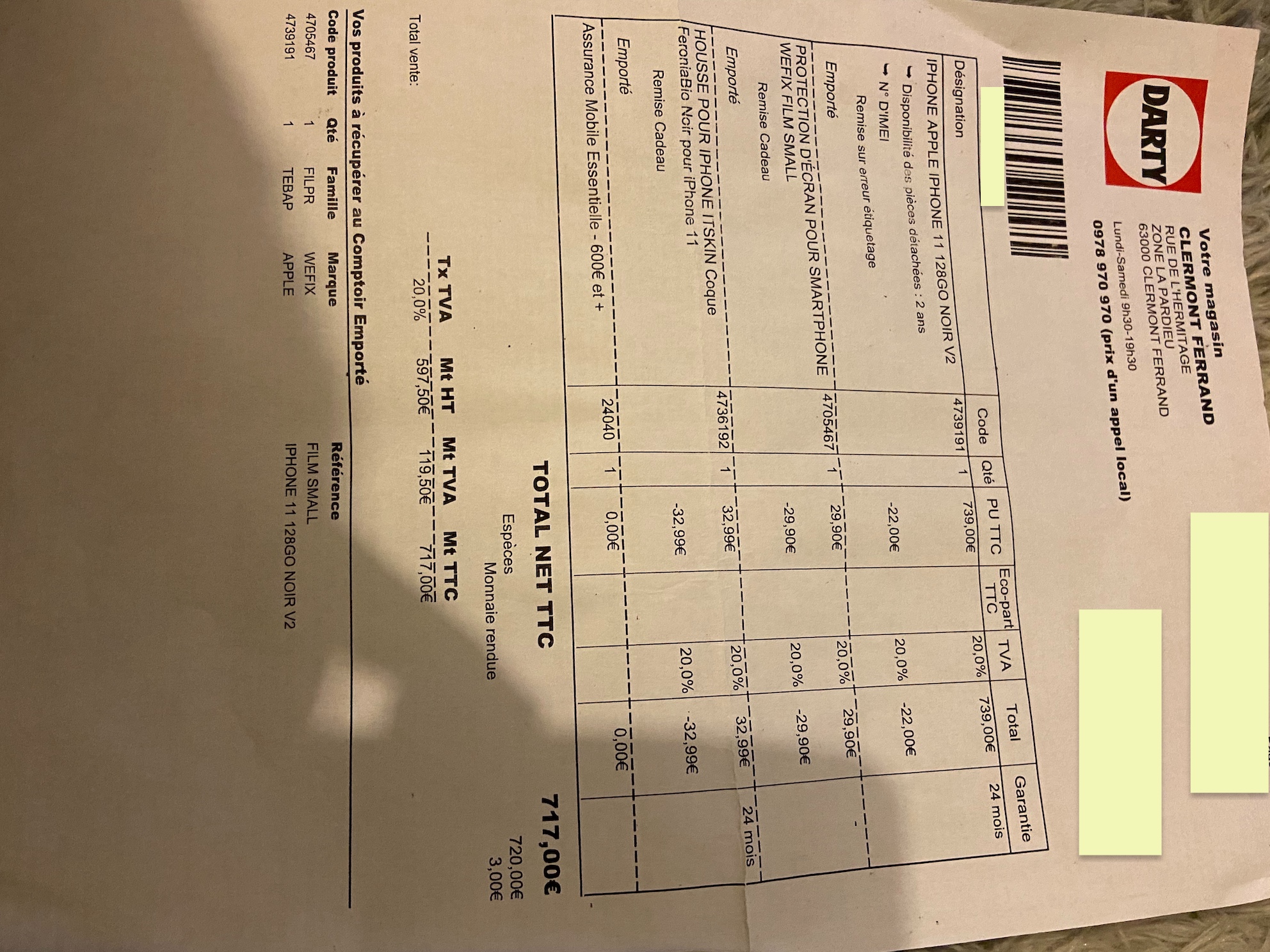 Je vous envoie la facture de mon téléphone je l’ai acheter à Darty en France à Clermont Ferrand dans le 63 il y a environs 10 mois je l’avais acheter en novembre.