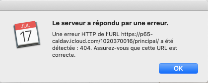 Je me suis abonné à un calendrier que j'ai depuis supprimé. Seulement, j'ai continuellement un message d'erreur 404 qui apparait sur l'URL https://p65-caldav.icloud.com/1020370016/principal/.